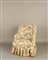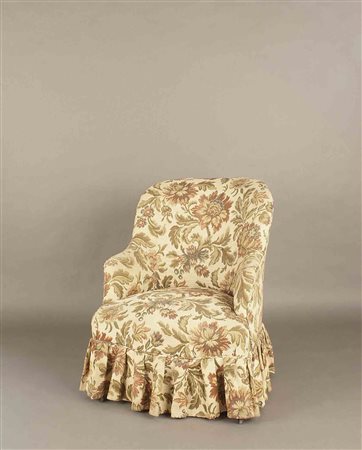 Poltroncina interamente rivestita in tessuto, poggiante su gambe in noce provviste di rotelle, vecchia manifattura, h. cm. 81.