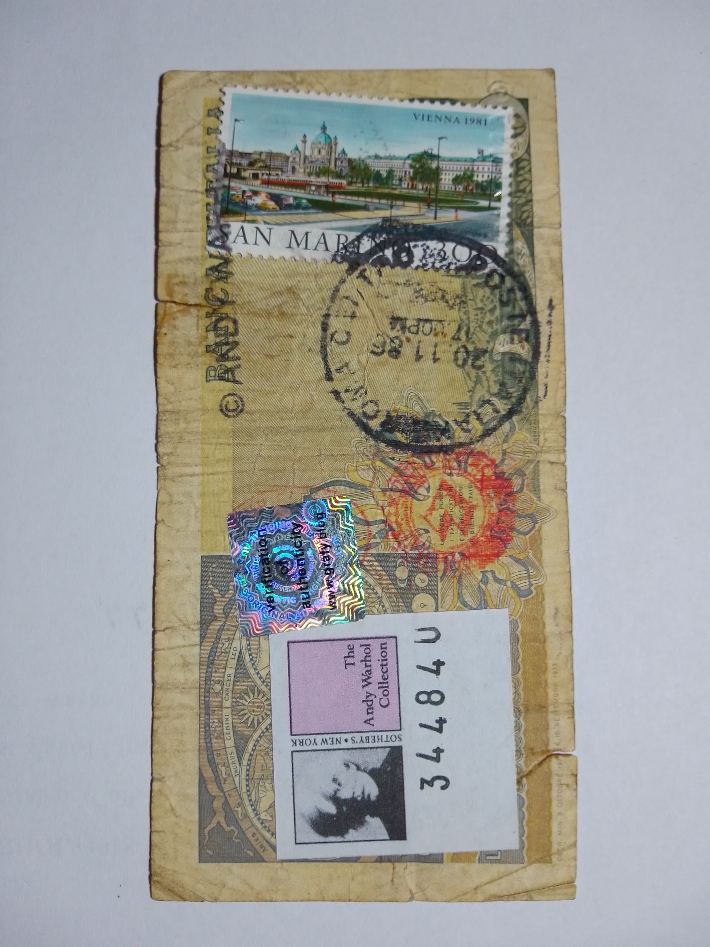 ANDY WARHOL (1928-1987) Intervento Banconota Italia 1973 Lire 2000 Galileo Galilei, Firma a Pennarello al Fronte, al Retro Francobollo San Marino Lire 300, N. Serie Timbro Fondazione Warhol Certificato Accluso, Presnta Riparazione e Pieghe, viene scontato dal prezzo originale
