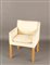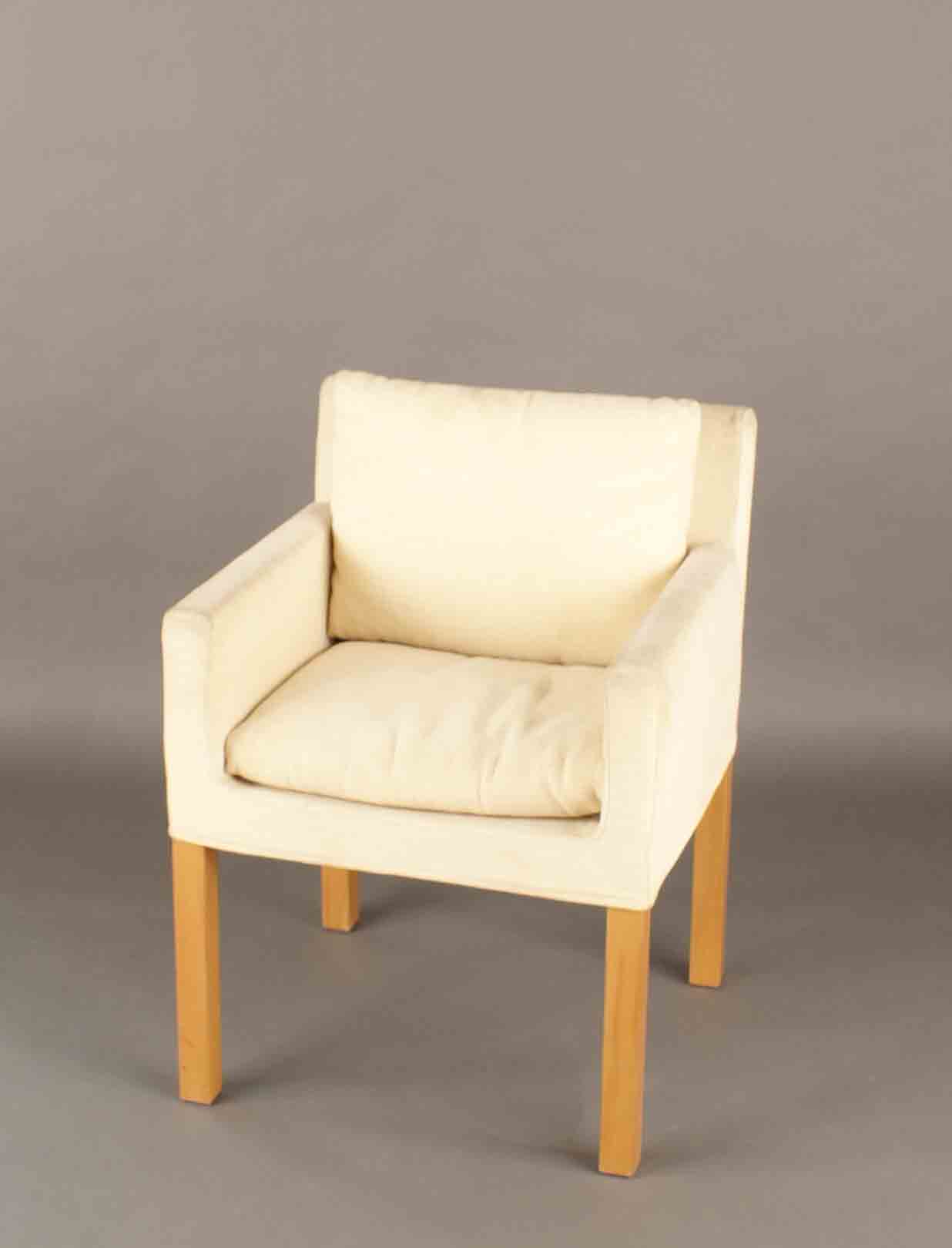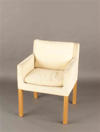 Poltroncina di linea squadrata, imbottita e rivestita in tessuto, gambe in faggio, h. cm. 78.