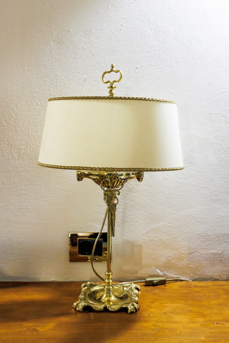 Lampada da scrivania in ottone con paralume in cotone bianco