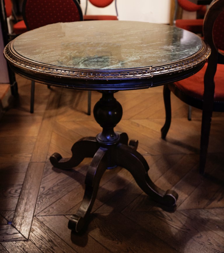 realizzato con piano incassato in marmo verde, bordo a foglioline, fusto tornito a balaustro su tre gambe mosse
