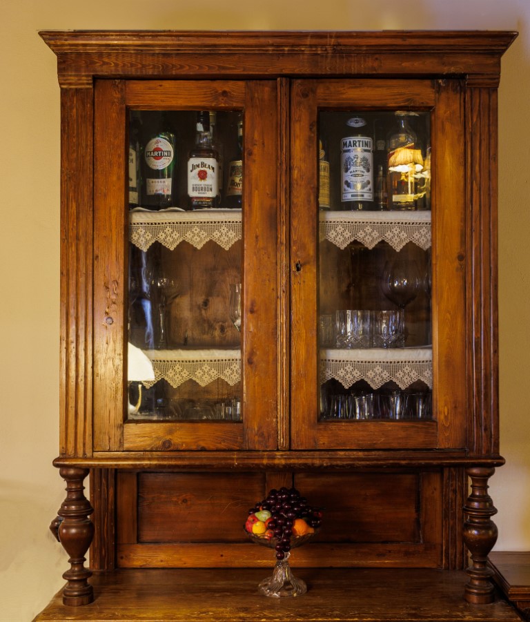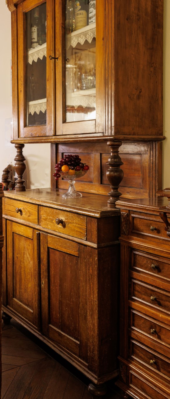 realizzata con corpo superiore con due sportelli a vetri, inferiore con due cassetti e due sportelli, base modanata e piedi a cipolla