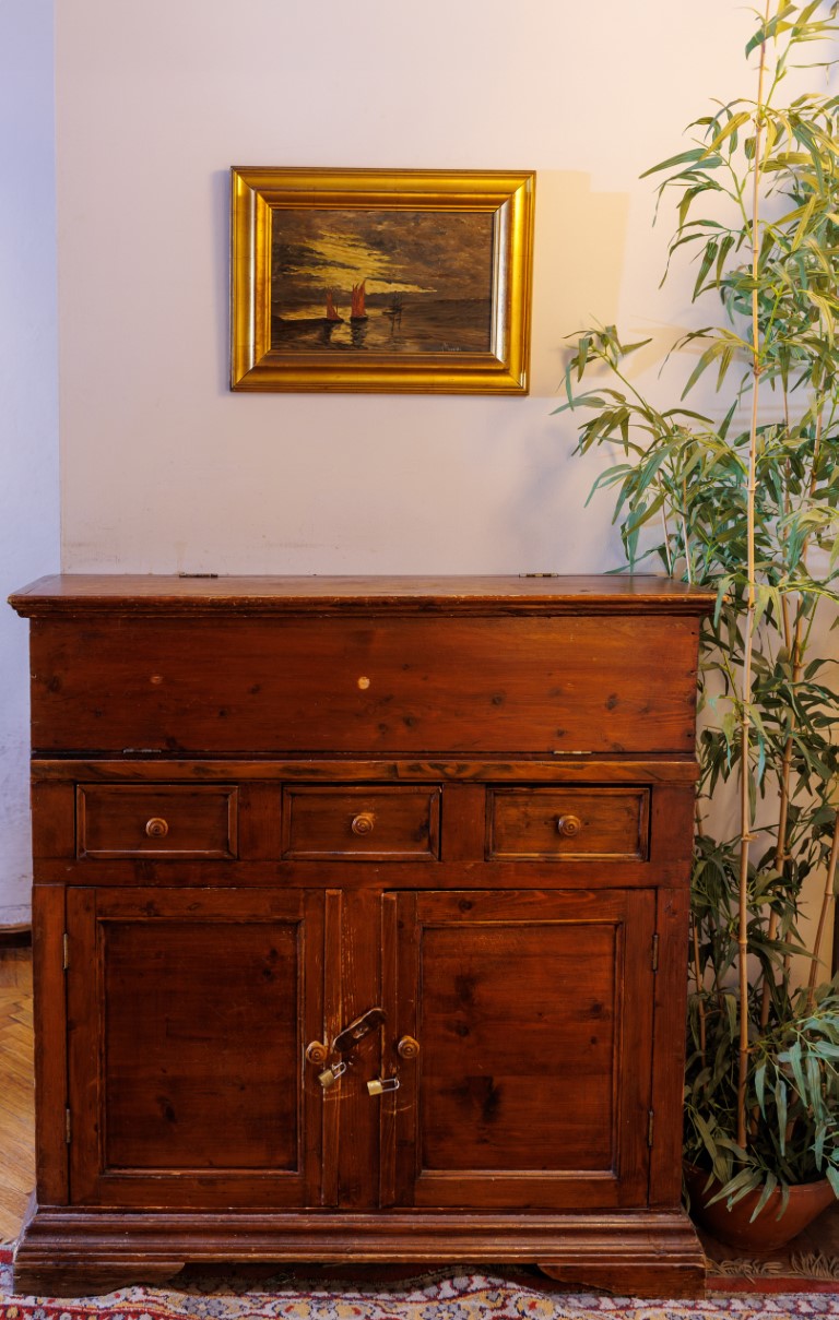 realizzata con un vano apribile sotto il piano, tre cassetti e due sportelli