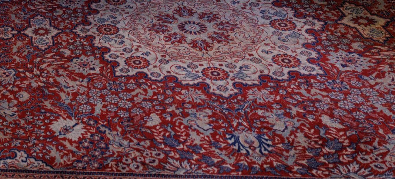 Tappeto persiano a fondo rosso e motivi floreali in blu