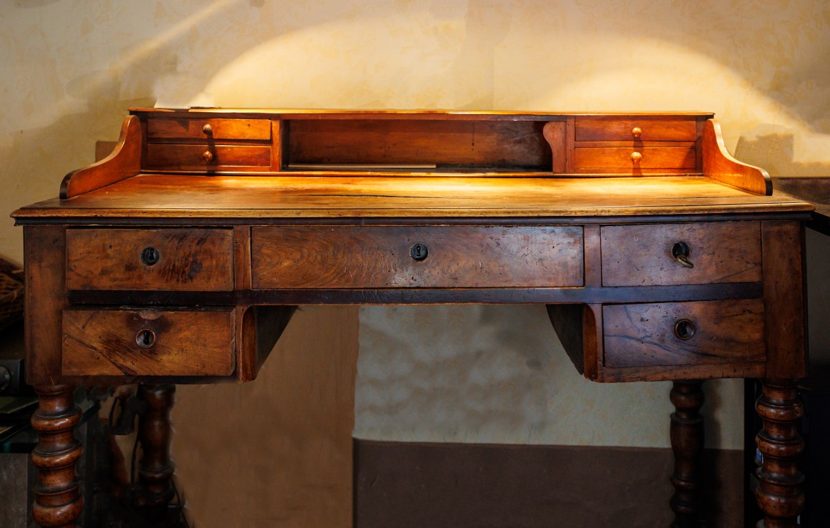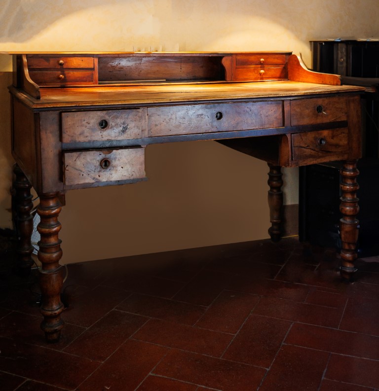 realizzata con alzata a quattro cassettini e vano a giorno, cinque cassetti sul fronte, gambe tornite a rocchetto
