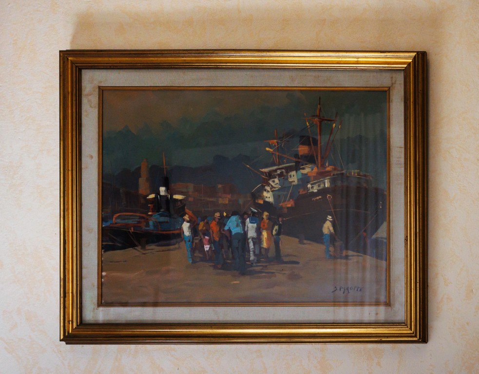 Veduta di molo con battello e figure Pittore italiano del XX secolo