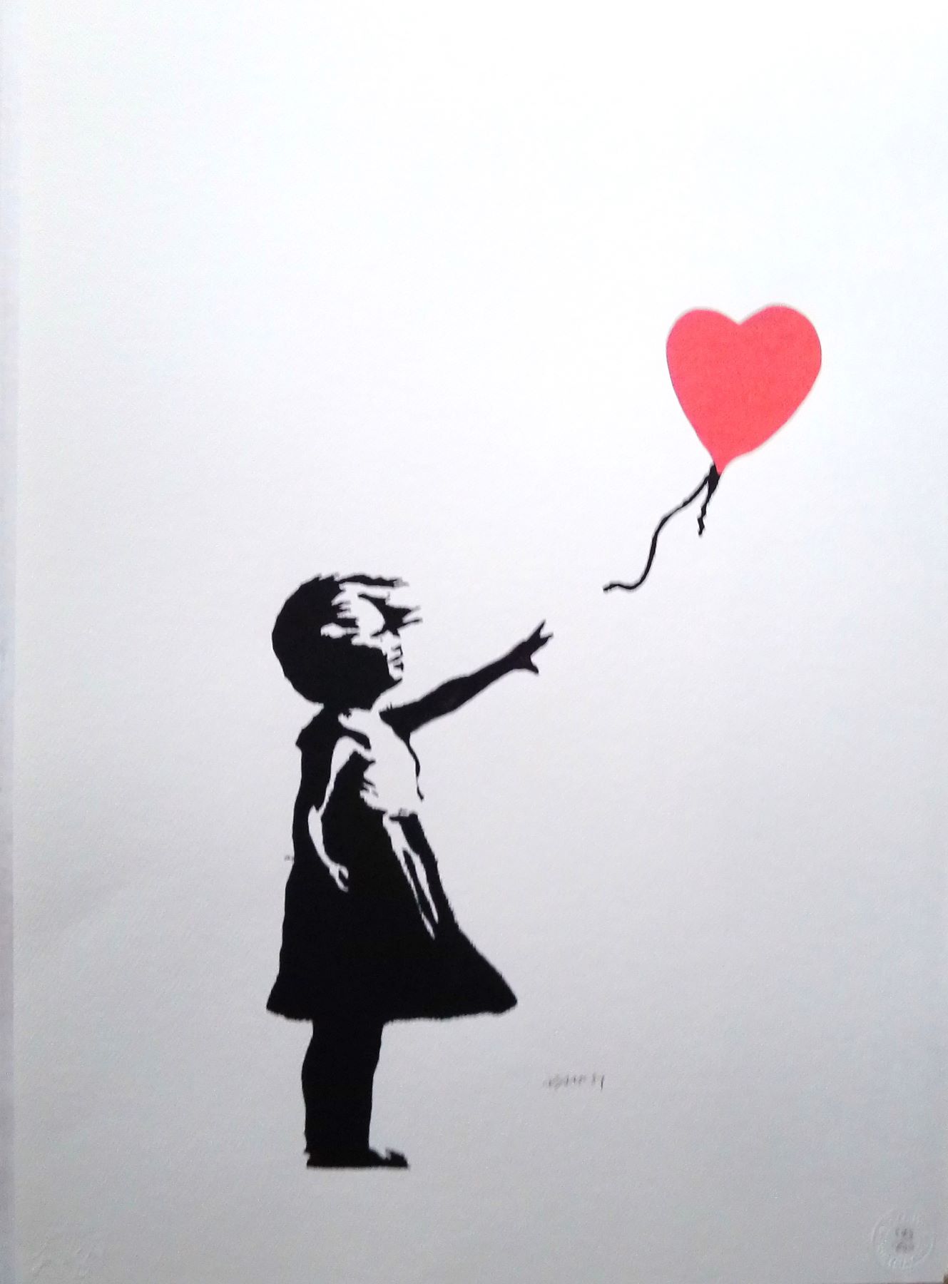 BANSKY (1974) Litografia Originale CM 70X50 Edizione Pow-Bansky, Titolo -La Famosa Bambina col Palloncino Rosso che Vola- Firma e Tiratura a Matita al Fronte, Timbro a Secco Pow-Elephant Certificato Accluso