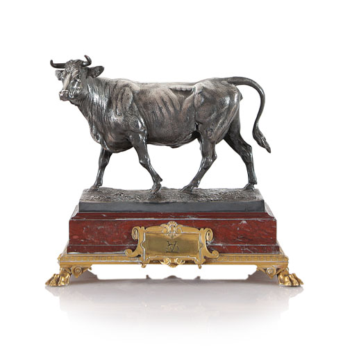 TORO IN METALLO ARGENTATO, SU BASE IN MARMO ROSSO E BRONZO DORATO, CHRISTOFLE & CIE, FINE XIX SECOLO, base a plinto su piedi ferini e cartiglio con monogramma "DV" inciso; marchio "CHRISTOFLE & C.ie" inciso.