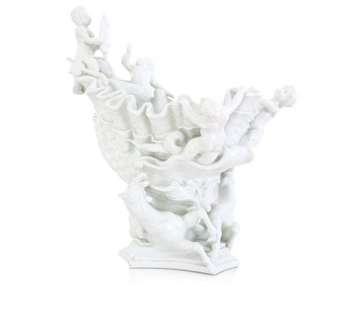 CENTROTAVOLA IN PORCELLANA BIANCA, GINORI, INIZIO XX SECOLO, a conchiglia retta da cavalli marini su base gradinata e sormontata da putti bicaudati, marchio in blu "N" coronato e "Ginori".