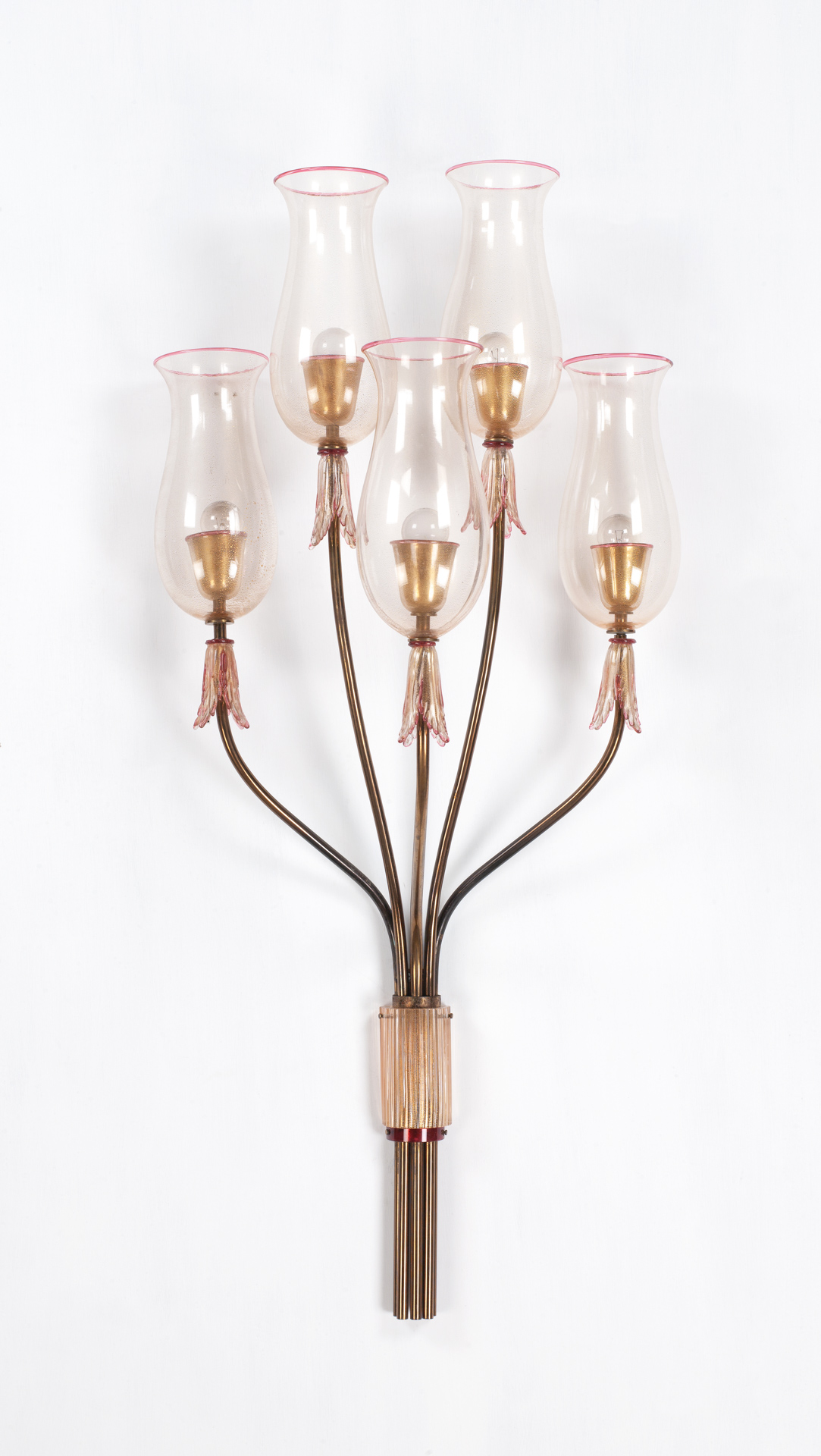 Seguso Vetri d’arte Murano Applique a cinque luci Hotel Bristol Merano, 1953/54;Coppe a forma di calice di tulipano, bordo e fiori in vetro rubino, struttura in ottone dorato, H. ca. 120 cm, larghezza 55 cm, sporgenza 31 cm, impianto elettrico da rifare