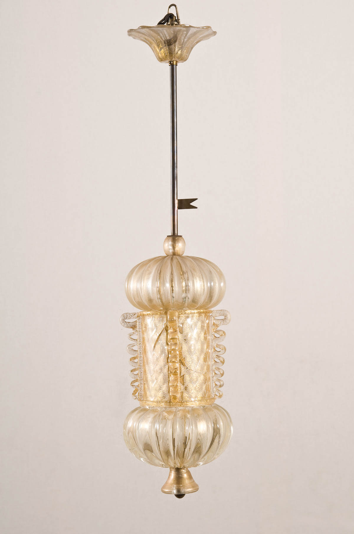 Seguso Vetri d’arte Murano Lampadario a sospensione Hotel Bristol Merano, 1953/54;Cosidetto "lampione veneziano", in vetro oro, H. 38 cm, asta di sospensione 37 cm, impianto elettrico da rifare