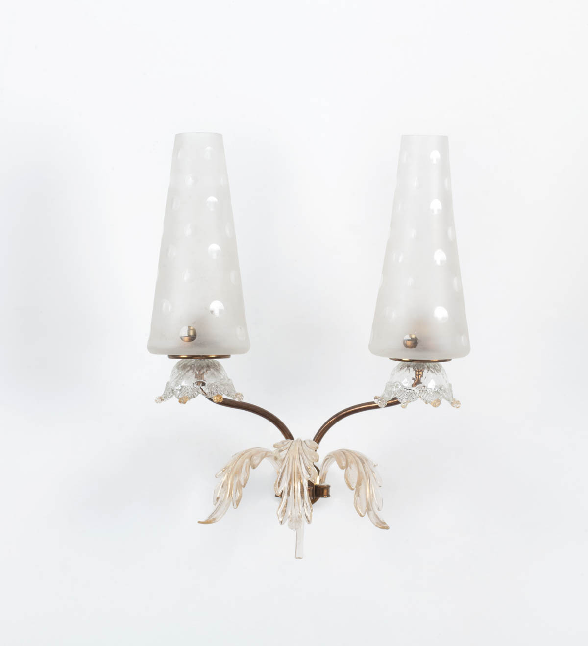 Seguso Vetri d’arte Murano Applique a due luci Hotel Bristol Merano, 1953/54;Coprivetro in vetro zigrinato di forma conica con inserti a pois, tre foglie in vetro color oro, struttura in ottone, H. 45 cm, larghezza 39 cm, sporgenza 30 cm, impianto elettrico da rifare