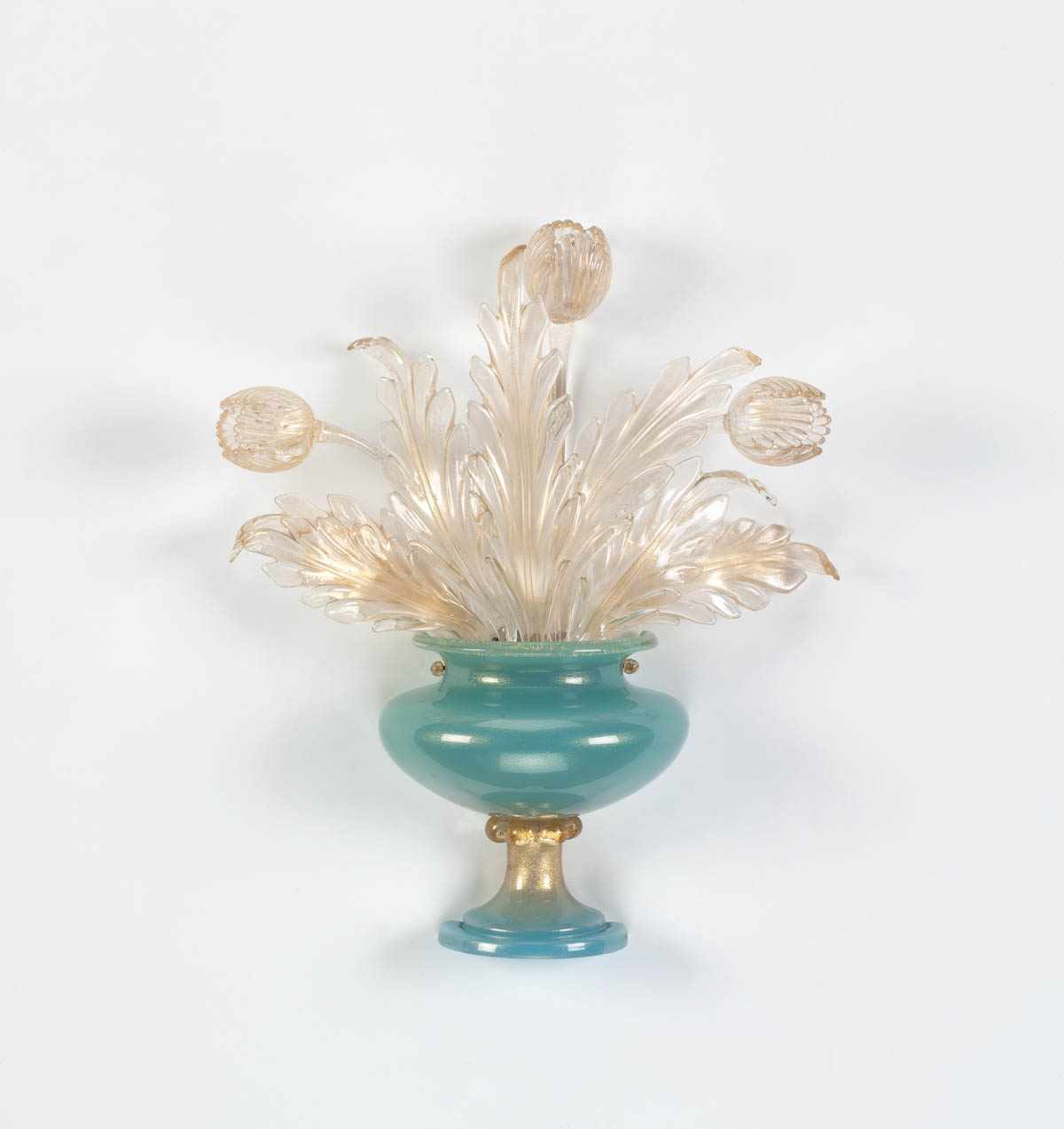 Seguso Vetri d’arte Murano Applique a due luci Hotel Bristol Merano, 1953/54;Cosidetta a "nido d’amore", base in vetro color azzurro/oro,