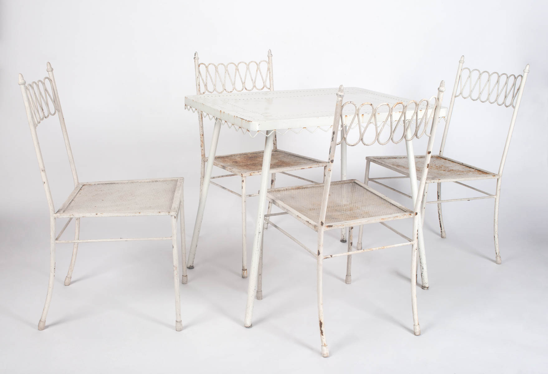 Italienische Manufaktur/Manifattura italiana Tavolo con 4 sedie Hotel Bristol Merano, 1953/1954;Ferro laccato color bianco, tavolo H. 80 x 60 cm,