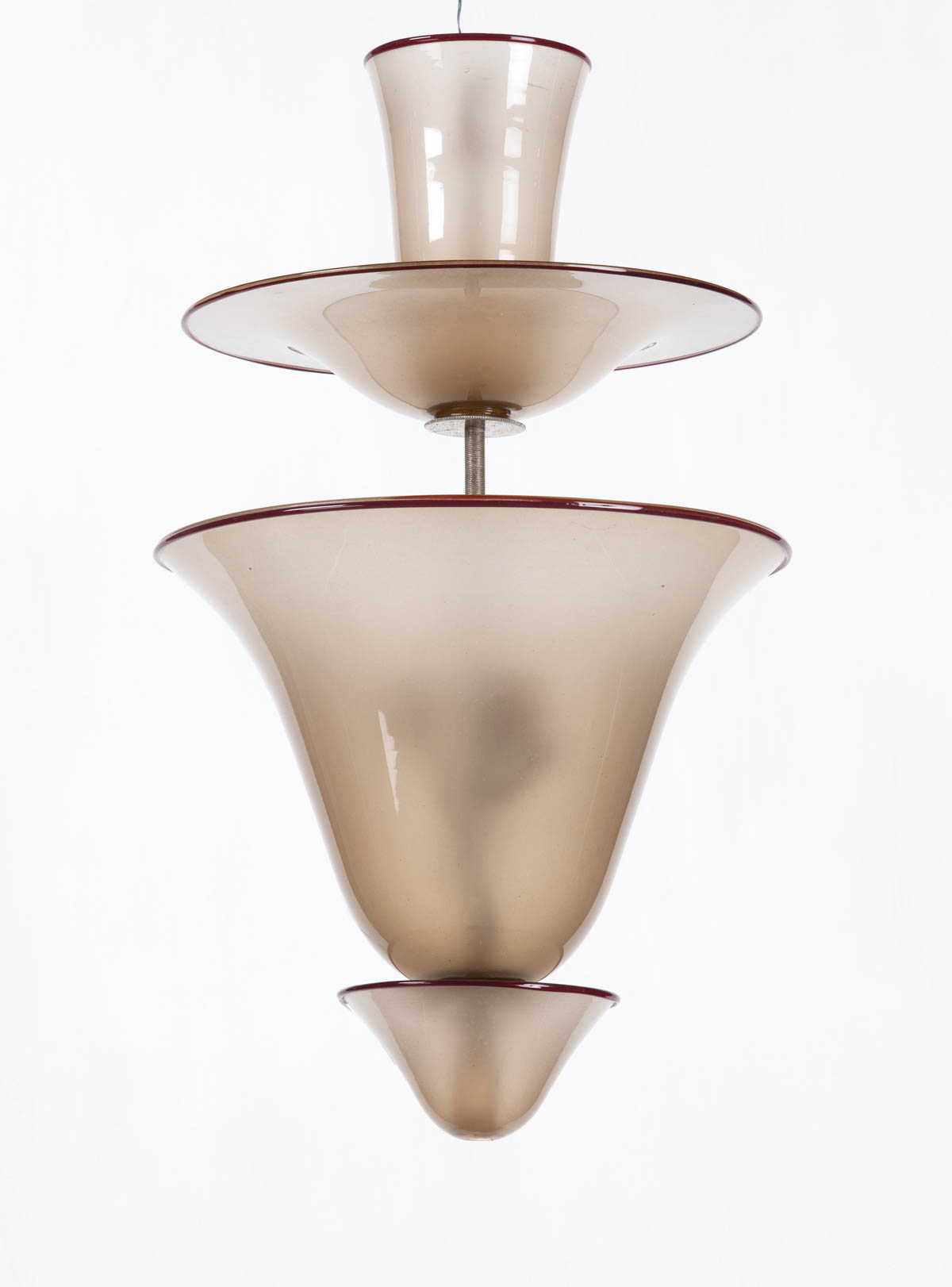 Venini (zugeschrieben/attribuito) Lampadario, Anni ‘50;Tre elementi in vetro opaco, bordi color rubino, H. 54 cm, larghezza max. 30 cm