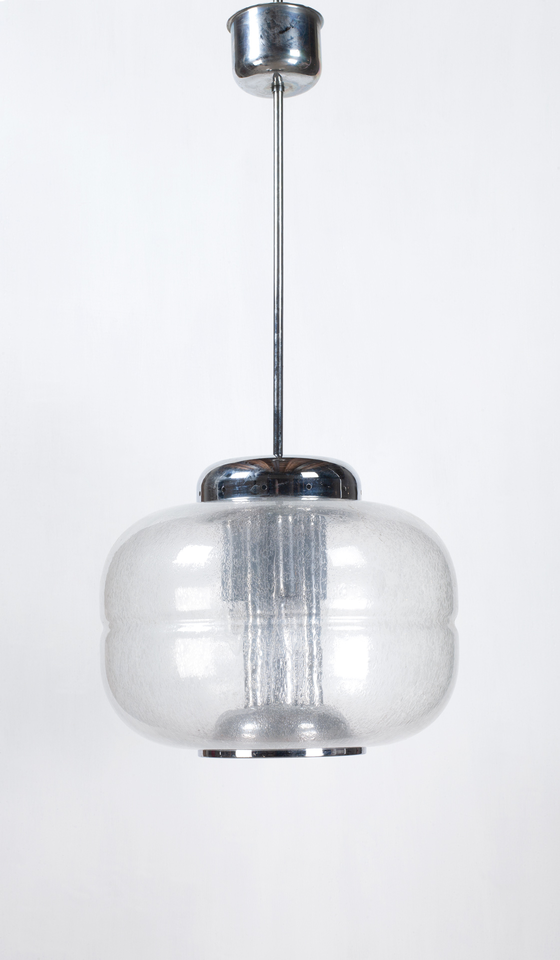 Italienische Manufaktur/Manifattura italiana Lampadario, Anni ‘60;Struttura in acciaio, vetro, H. 55 cm, diam 45 cm