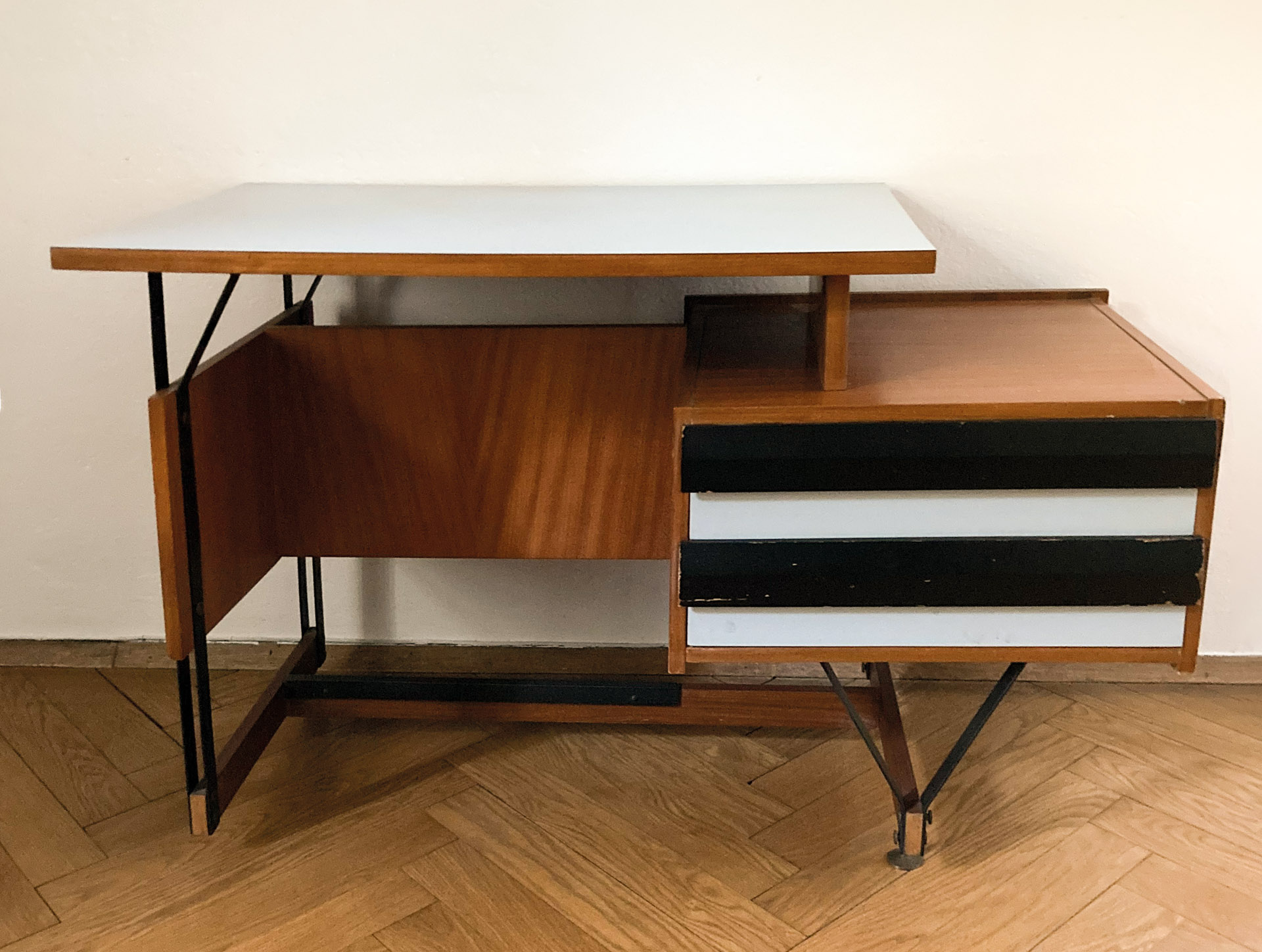 Italienische Manufaktur/Manifattura italiana Scrivania, Anni ‘60;n legno, pianale in formica color azzurro, segni del tempo