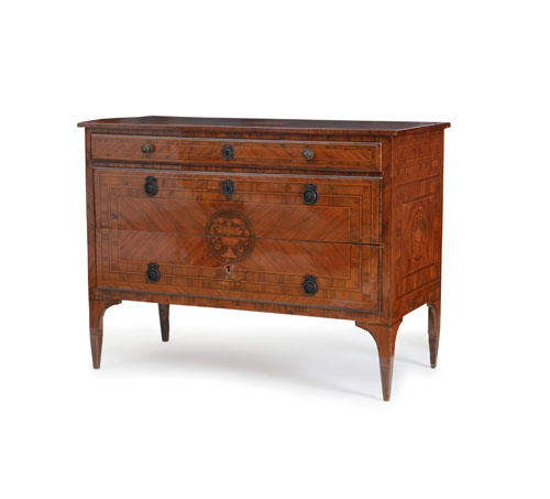 CASSETTONE LUIGI XVI INTARSIATO, LOMBARDIA, FINE XVIII SECOLO, a tre cassetti con decori ad intarsi neoclassici e a filettature geometriche, gambe rastremate; sbeccature e usure.