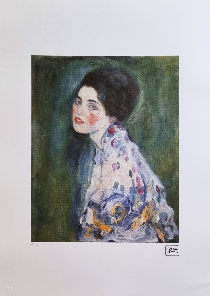 KLIMT GUSTAV Baumgarten 1862 - Vienna 1918 "Senza titolo" Riproduzione litografica cm 50x70. Firmata in stampa sul fronte in basso a destra, tiratura 142/200 a sinistra e timbro a secco. Sul retro ologramma di autenticità.
