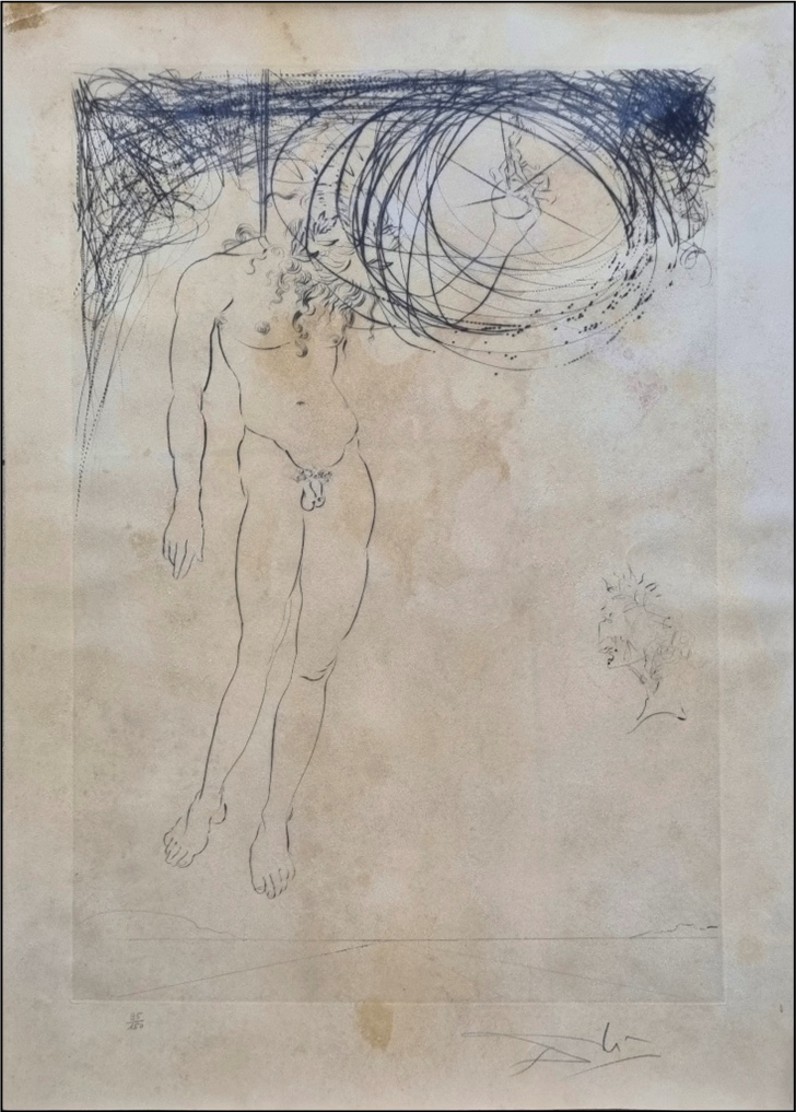 DALI' SALVADOR Spagna 1904 - 1989 "Senza titolo" Incisione litografica su cartoncino pergamenato cm 44x61. Firmata sul fronte in basso a destra, tiratura 95/150. (Presenta tracce di umidità).