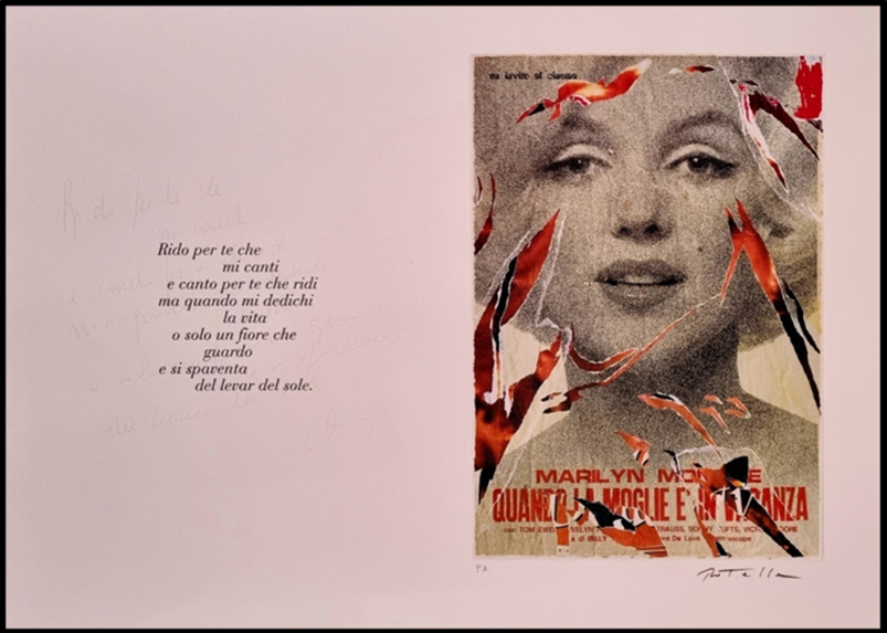 ROTELLA MIMMO Catanzaro 1918 - Milano 2006 "Atto d'amore" Serigrafia su cartoncino cm 70x50. Firmata sul fronte in basso a destra, tiratura P.A. a sinistra, con poesia. Certificato di autenticità a cura della Spirale Arte Milano.