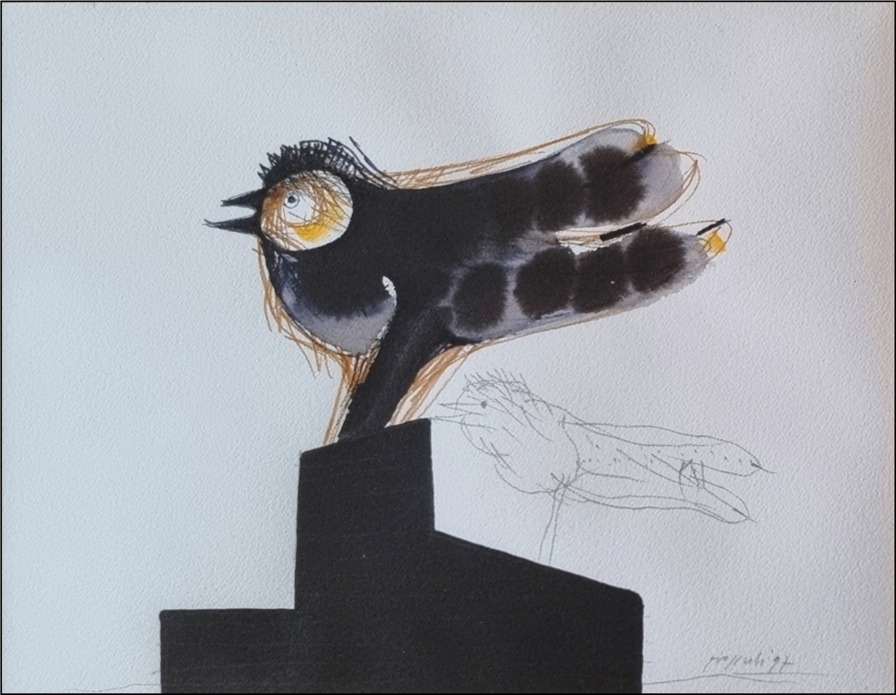 POZZATI CONCETTO Vo' 1935 - Bologna 2017 "Sentinelle" Matita, inchiostro e acrilico su carta cm 32x24, del 1997. Firmato e datato sul fronte in basso a destra. Certificato di provenienza e di autenticità di altra casa d'aste.
