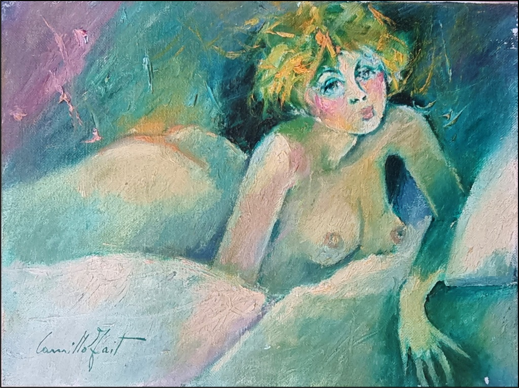 FAIT CAMILLO Milano 1935 "Sulle lenzuola" Olio su tela cm 40x30. Firmato sul fronte in basso a sinistra. Sul retro titolo, firma e timbro con numero d'archivio.