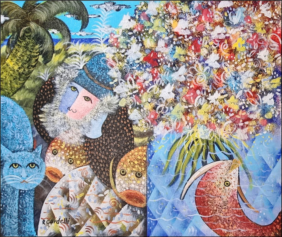 CARDELLI RAIMONDO Marsiglia 1938 - Lucca 2008 "La mia isola" Olio su tela cm 60x50. Firmato sul fronte in basso a sinistra. Sul retro titolo e firma per autentica.