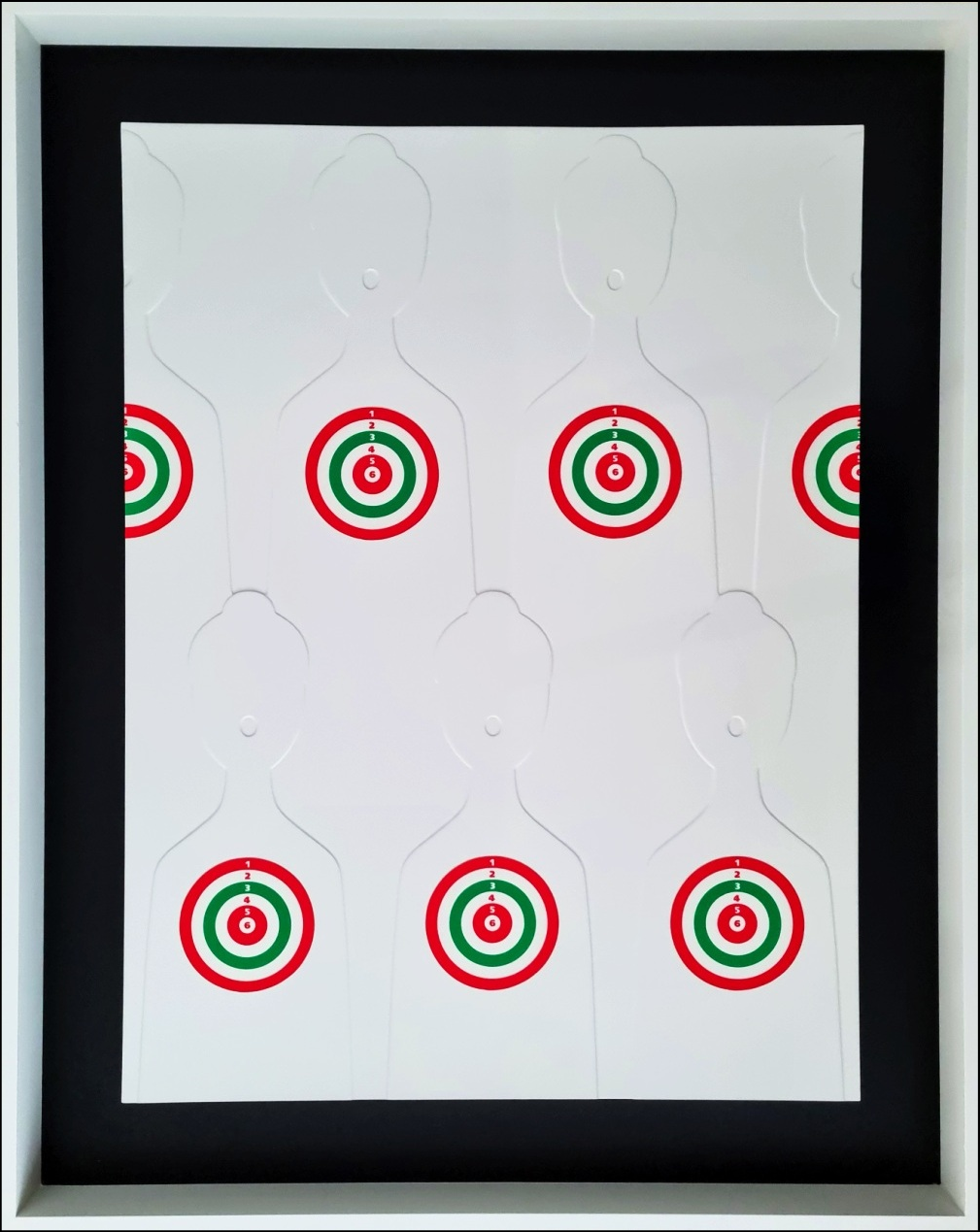 BUENO ANTONIO Berlino 1918 - Fiesole 1984 "Concerto tirassegno" Multiplo polimaterico scolpito su lastra in legno, verniciata ad acrilico, cm 87x109 cornice, cm 69x80 disegno. La cornice è parte integrante dell'opera. I bersagli sono stampati in serigrafia su carta cotone. Esemplare n. IX/LXXV.