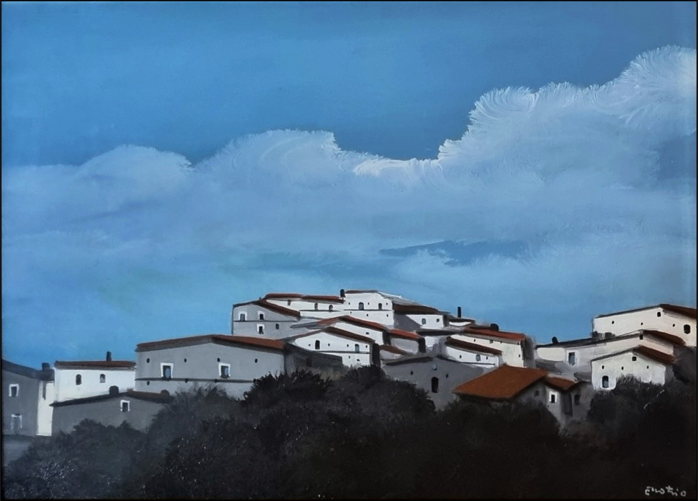 PUGLIESE ENOTRIO Buenos Aires 1920 - Pizzo 1989 "Paesaggio calabrese" Olio su tavola cm 70x50. Firmato sul fronte in basso a destra. Sul retro titolo, firma, misure, numero d'archiviazione e timbri dell'artista.