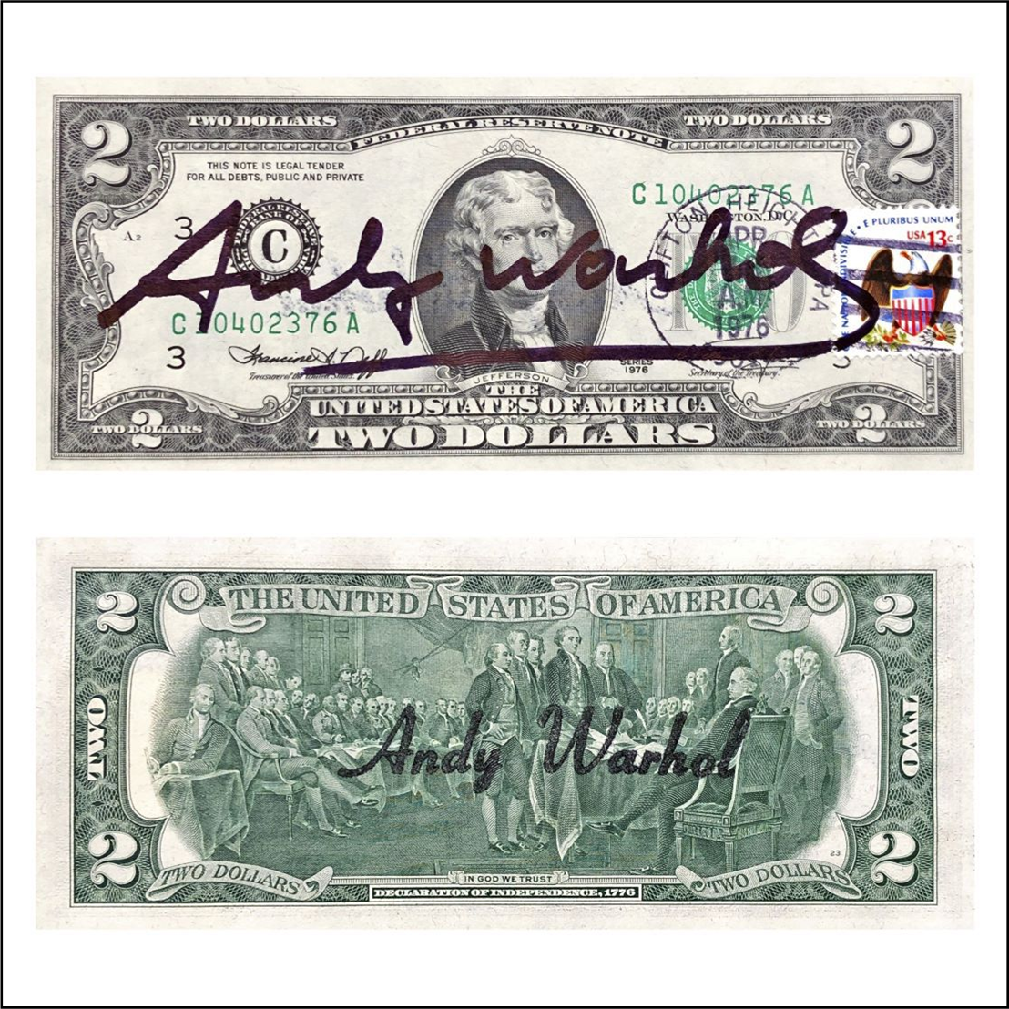 WARHOL ANDY Pittsburgh 1928 - New York 1987 "2 Dollars - C10402376A" Banconota da 2 dollari recante sul fronte firma autografa dell'artista, francobollo e timbro postale USA del 13 aprile 1976. Sul retro timbro della "Factory Warhol". Dimensioni mm 155,955x66,294 come riportate su certificato di autenticità ed unicità dell'esemplare, emesso da GALERIE 32 - Nizza. Opera contenuta in espositore in plexiglass.