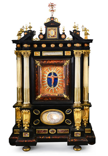 RARO ED IMPORTANTE ALTARE IN CORALLO, PIETRE DURE, BRONZO DORATO, TARTARUGA, EBANO E SMALTI, TRAPANI, XVII SECOLO, a struttura architettonica centrato da crocefisso entro raggiera ovale e cornice modanata, sostegni a colonne con capitelli corinzi con cimature a putti, sfere e vaso fiorito, fregi a foglie accartocciate alle base.
