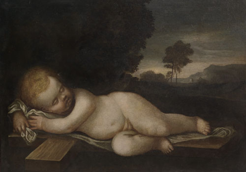 SCUOLA EMILIANA DEL XVII SECOLO Gesù dormiente Olio su tela, cm 67,5x93.