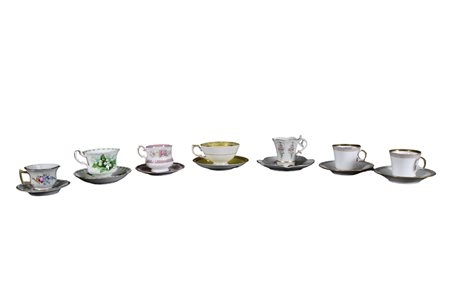 LOTTO DI 7 TAZZE CON PIATTINO da collezione di varie manifatture e provenienze misure varie