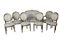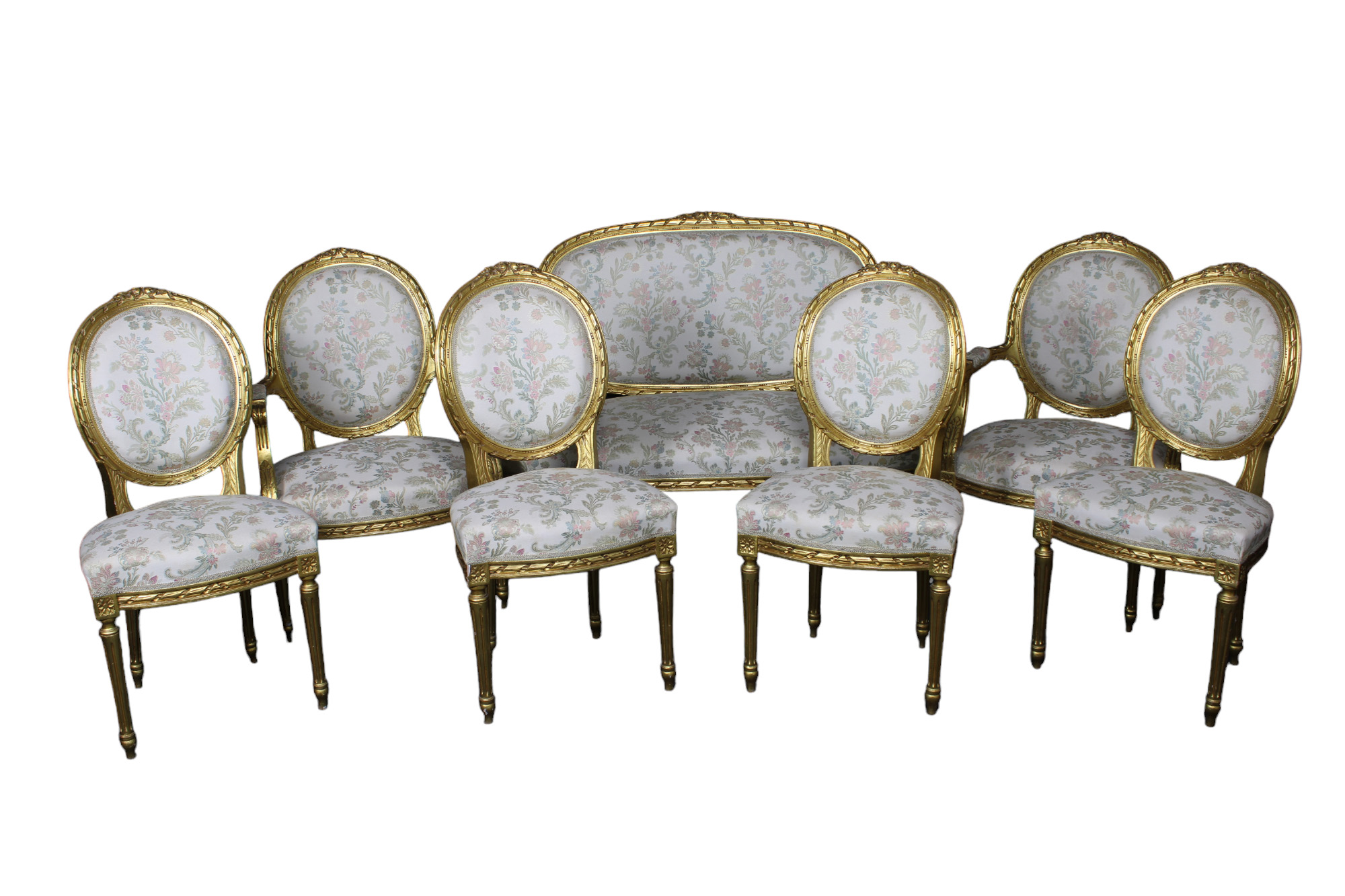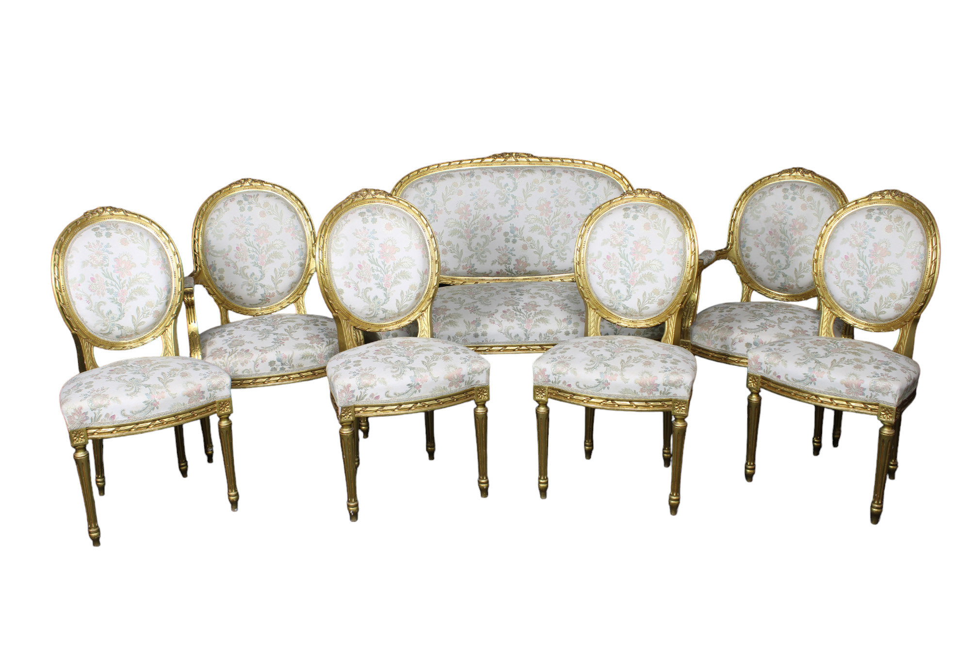 SALOTTO dorato e intagliato composto da: divano, 2 poltrone, 4 sedie con tessuto decorato da fiori,in buone condizioni Francia fine 800 primi 900 h cm 100 x 130 x 62 / h cm 95 x 62 x 57 / h cm 95 x 49 x 45