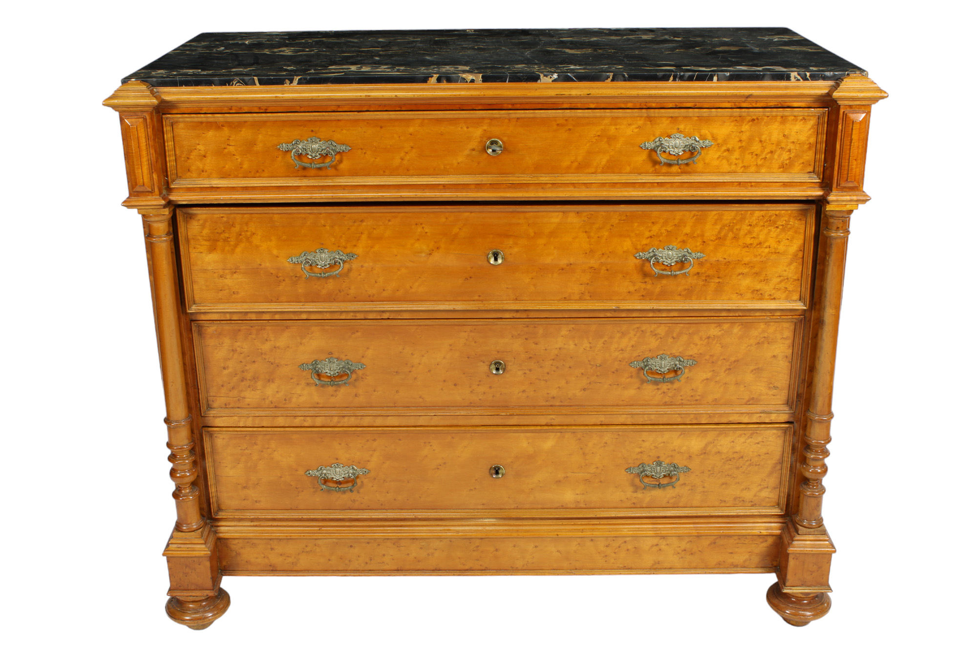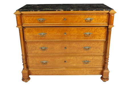 CASSETTONE in acero a quattro cassetti arricchito da colonne tornite, marmo nero portoro e maniglie in bronzo Genova XIX secolo h cm 99 x 118 x 58