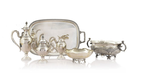 LOTTO DI DIVERSI OGGETTI IN ARGENTO, XX SECOLO, composto da un servizio da caffé in stile Impero con caffettiera, lattiera, zuccheriera con coperchio e vassoio, un centrotavola biansato su piedini, una coppetta circolare, un set di quattro posate da antipasto, coppia di tazze con piattino (interno in porcellana) e dodici cucchiaini.