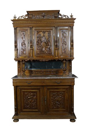 CREDENZA DOPPIO CORPO in noce, parte inferiore a 2 sportelli e 2 cassetti con piano in marmo rosso di Francia che supporta parte superiore a 3 ante di cui quella centrale scolpita al alto rilievo raffigurante scena di vita musicale con castello in prospettiva maestranze fiamminghe XIX secolo h cm 240 x 140 x 51