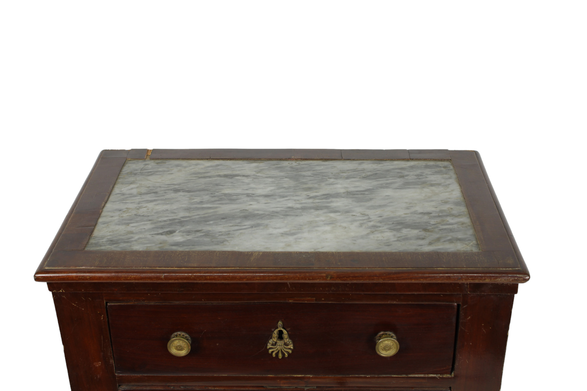 PICCOLA CONSOLLINA in piuma di mogano a due cassetti con gambe anteriori a colonne con capitelli e applicazioni in bronzo dorato e piano incassato in marmo grigio di Billiemi Sicilia XIX secolo h cm 91 x 54 x 33