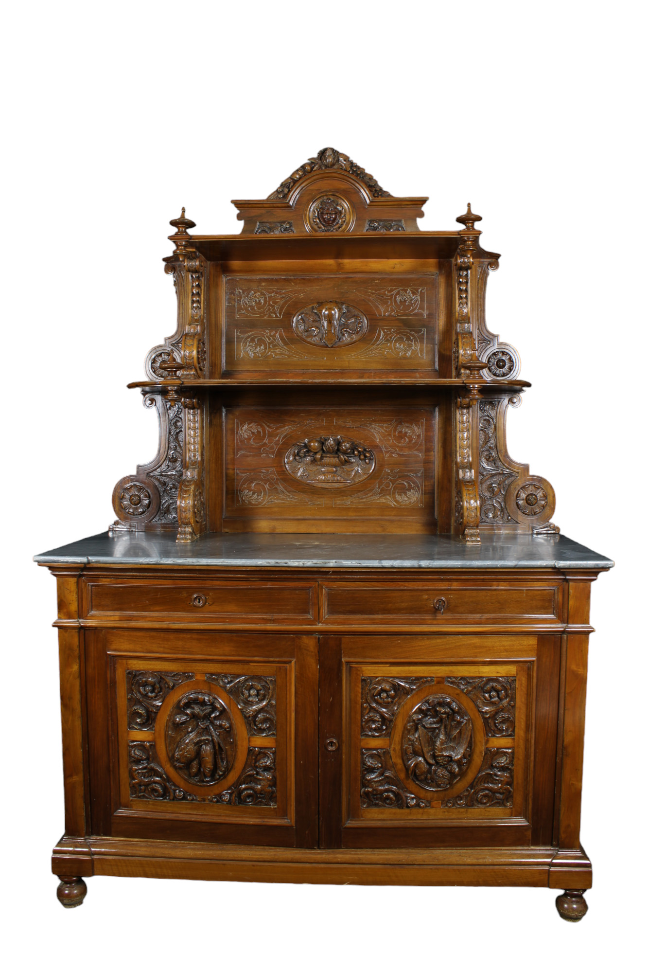 IMPORTANTE PIATTAIA A DUE SPORTELLI in noce riccamente intagliata sulla parte superiore reca stemma nobiliare Sicilia XIX secolo h cm 256 x 172 x 72