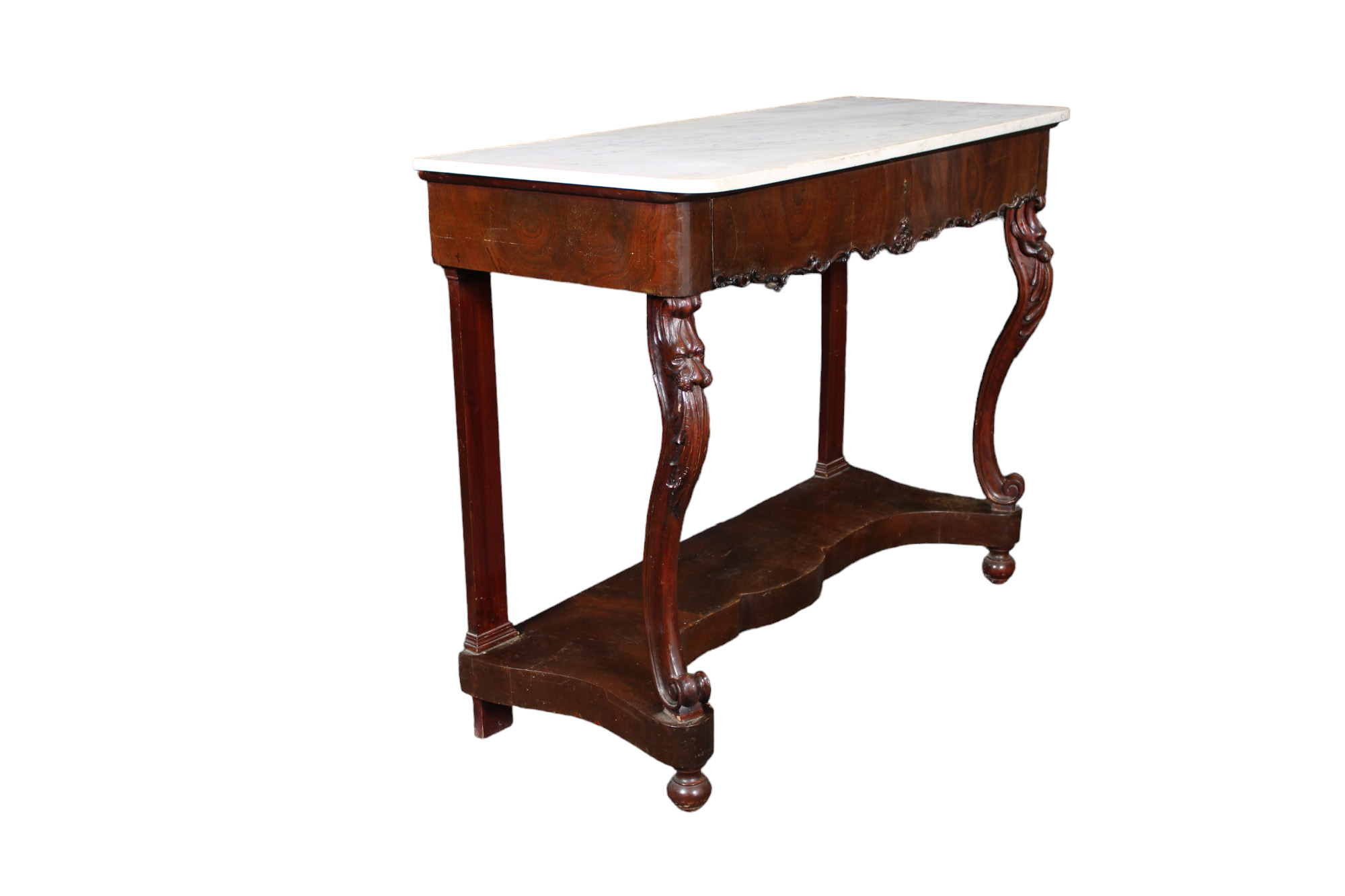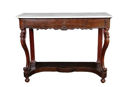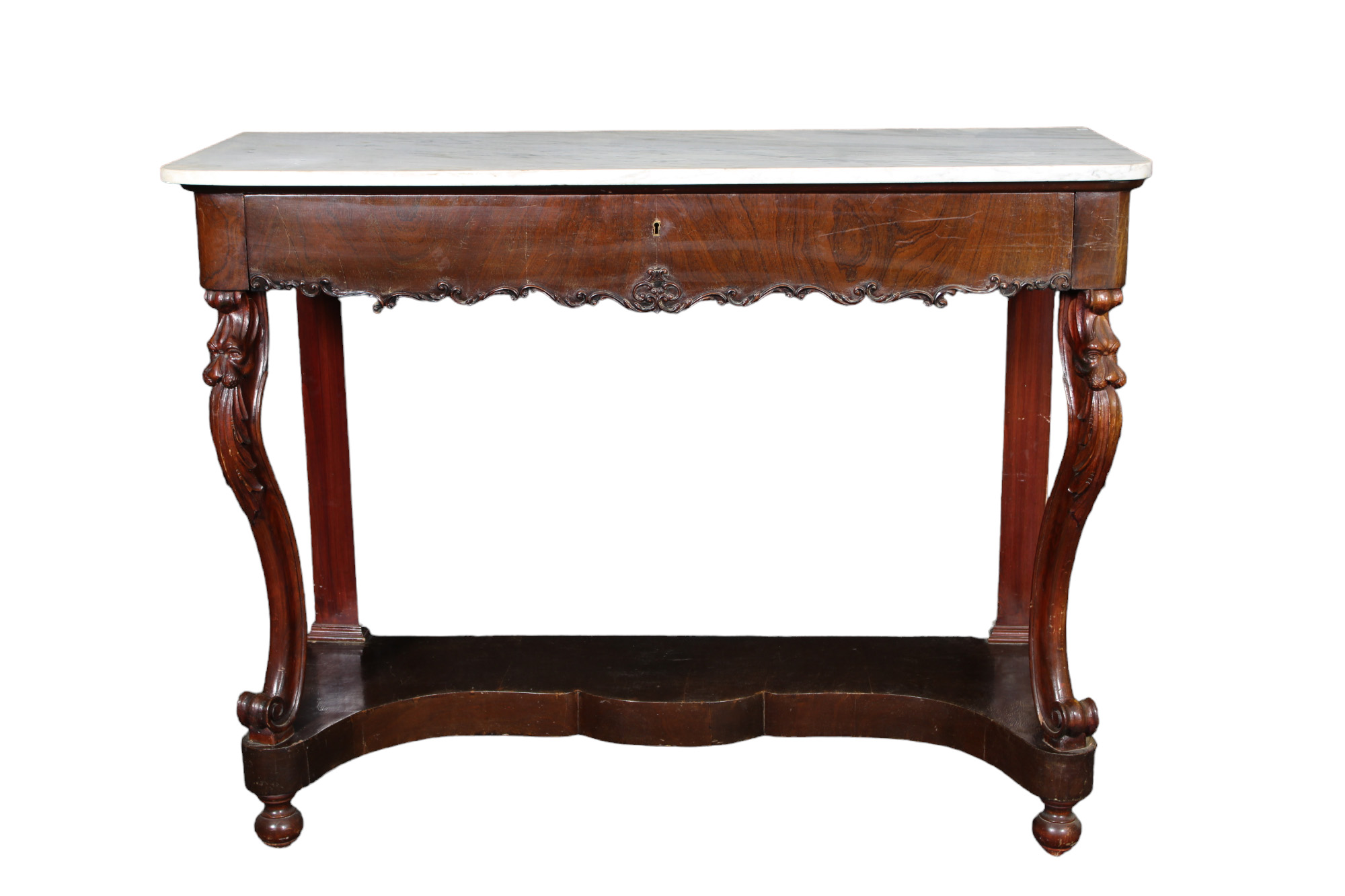 CONSOLLE LUIGI FILIPPO in mogano con cassetto e gambe a virgola scolpite e raffigurante figure leonine, piano in marmo bianco di Carrara Sicilia XIX secolo h cm 102 x 134 x 54