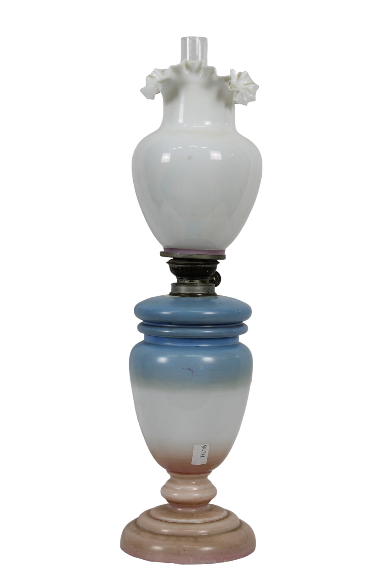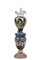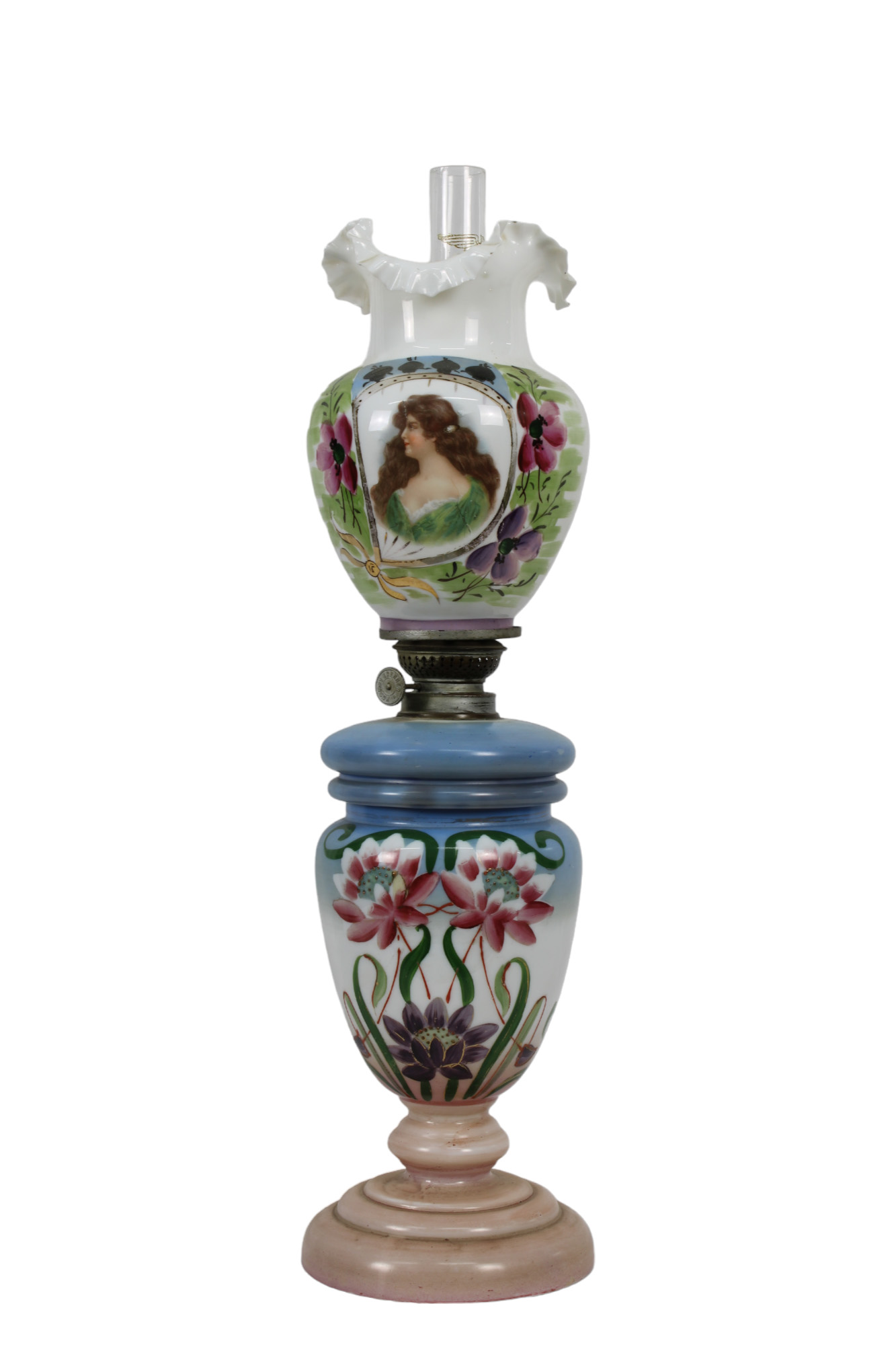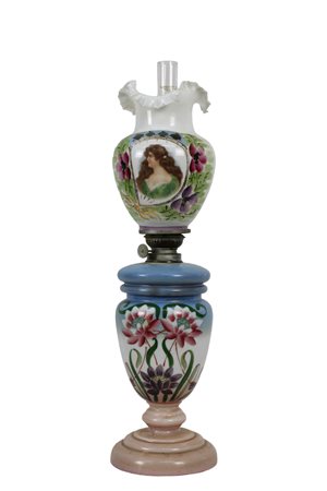 LUME in opaline dipinta a motivi floreali con boccia decorata, dentro riserva figura femminile Sicilia fine XIX secolo h cm 57 x 14