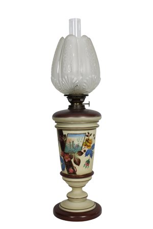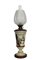LUME DA TAVOLO in opaline dipinto e decorato a motivi trompe l’oeil con boccia in vetro satinato Sicilia XIX secolo h cm 70 x 17