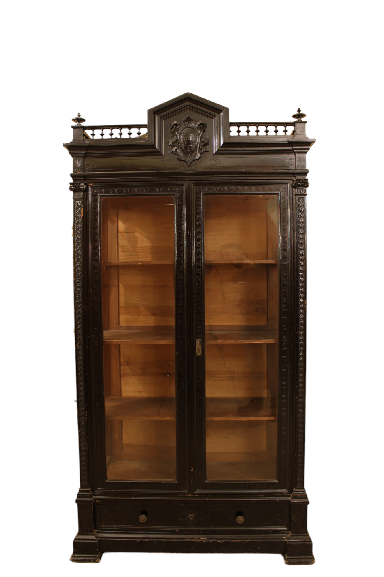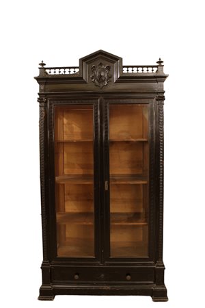 BELLA VETRINA A 2 ANTE in legno ebanizzato e inciso con cassetto alla base e cimasa arricchita da stemma scolpito e ringhiera Sicilia XIX secolo h cm 232 x 125 x 51