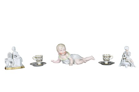 LOTTO DI 5 OGGETTI DI CUI 1 SCULTURA in biscuit dipinto raffigurante bambino, rottura alla mano, 1 GRUPPO in porcellana Bambino con cane 1 GRUPPO raffigurante Donna con uccellino e 2 TAZZINE di gusto impero varie manifatture XX secolo misure varie