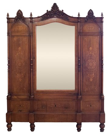 ARMADIO A 3 ANTE in noce decorato da ricchi intagli, tarsie in bosso Sicilia 800 h cm 218 x 168 x 55