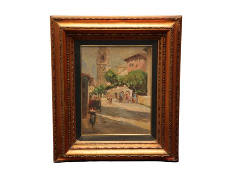 OLIO SU COMPENSATO raffigurante scorcio di paese con personaggi firmato in basso s/x XX secolo h cm 28 x 21