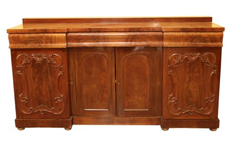 CREDENZA VITTORIANA in mogano a 4 sportelli decorati da profili scolpiti e tre cassetti nella parte superiore Inghilterra XIX secolo h cm 105 x 200 x 65