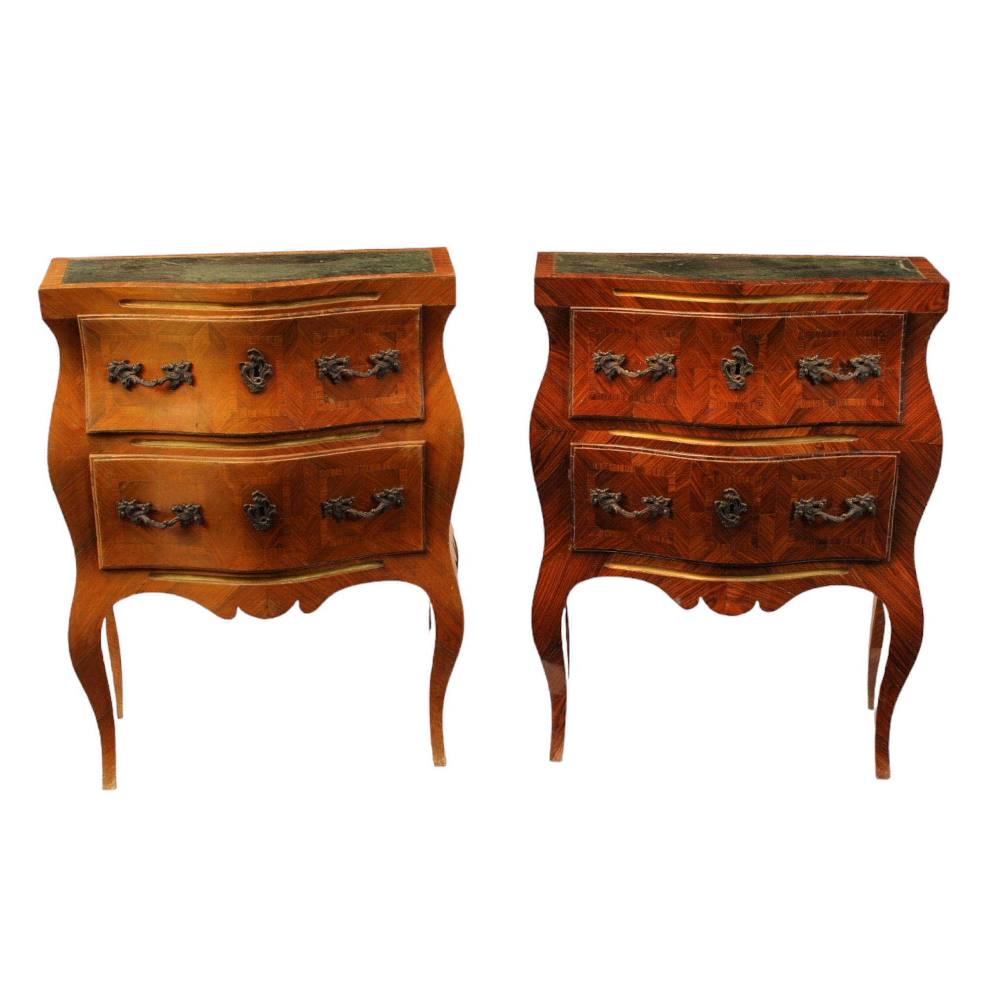 COPPIA DI COMODINI A 2 CASSETTI in ebano viola e applicazioni in bronzo, piano in marmo verde delle Alpi di gusto settecentesco maestranze siciliane XIX / XX secolo h cm 71 x 54 x 31