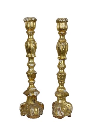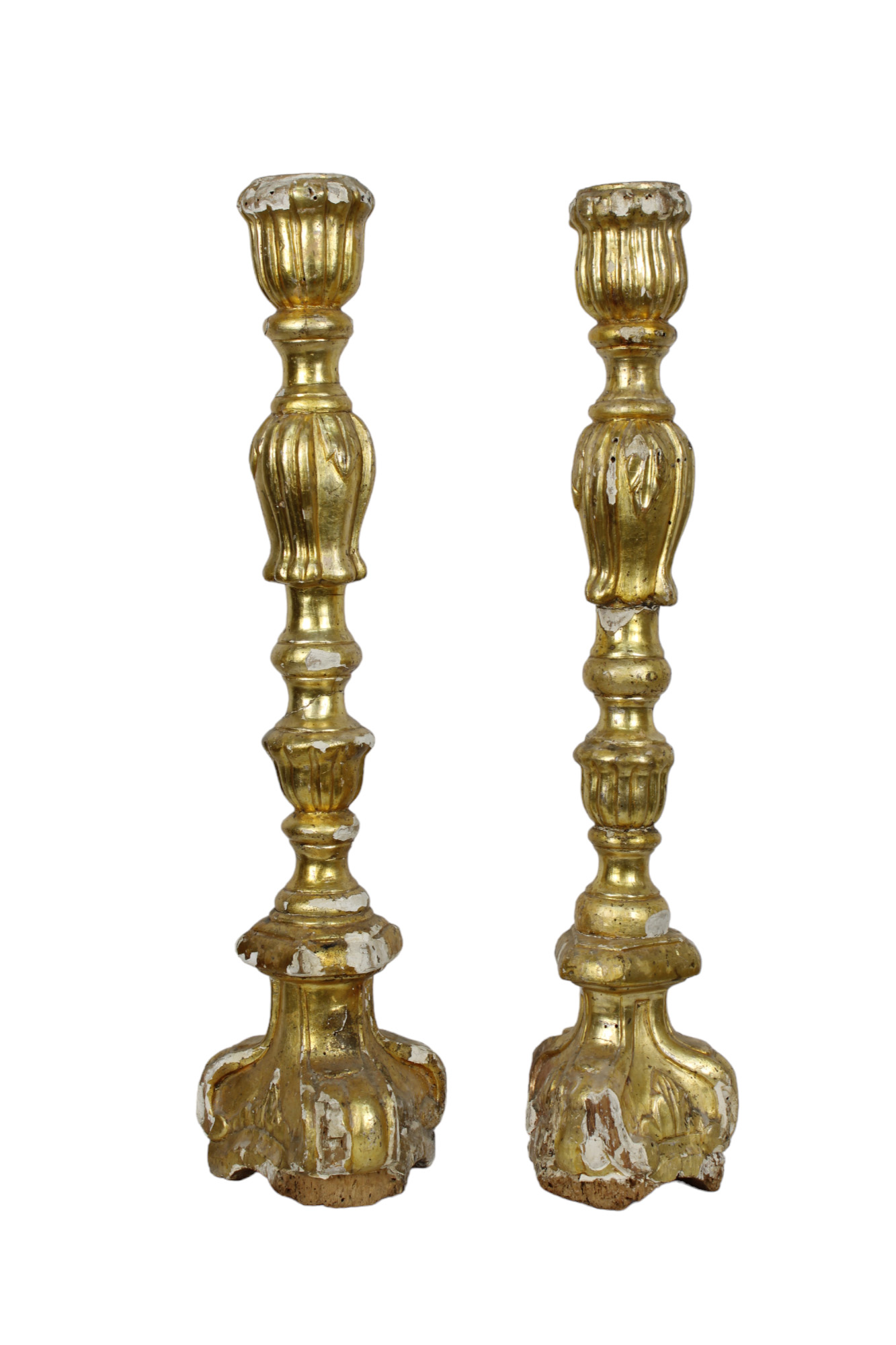 COPPIA DI TORCERI in legno finemente torniti e scolpiti dorati a oro zecchino Sicilia XVIII secolo h cm 51 x 11 x 11